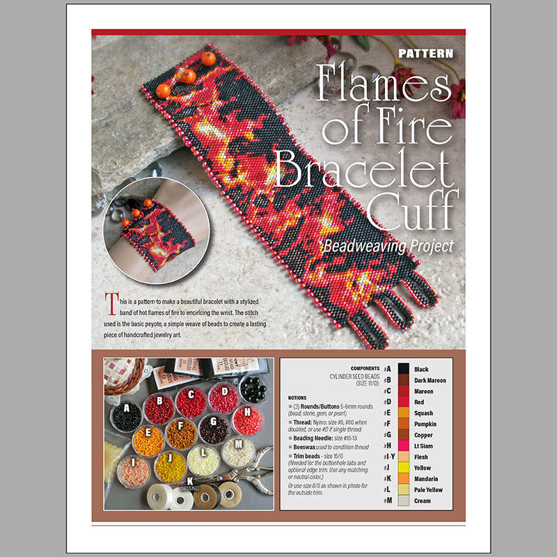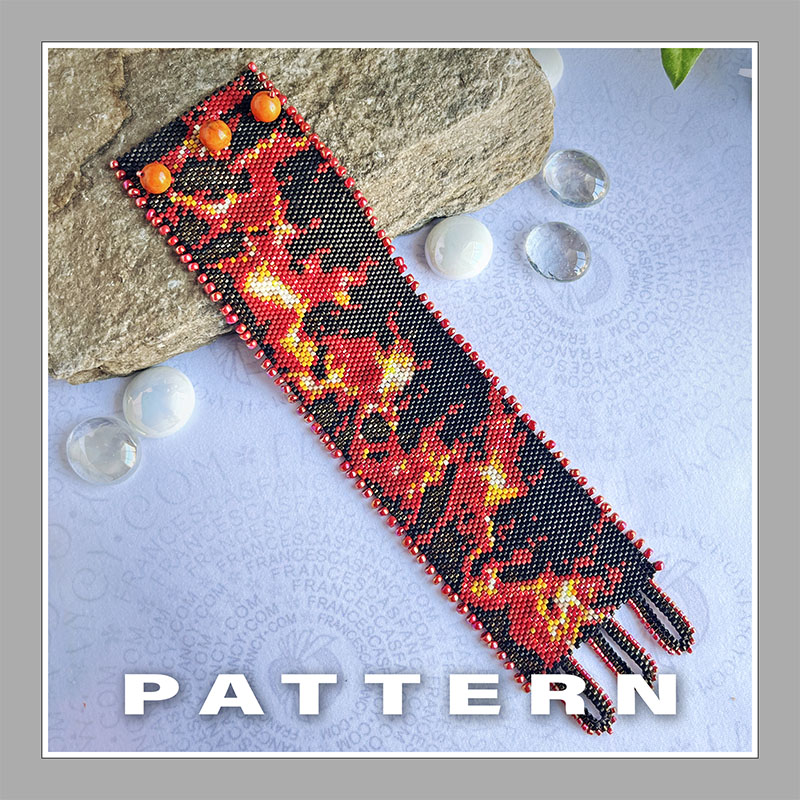 This pattern is a hot blaze of flames as a beaded bracelet cuff. Done in the single even-count peyote stitch using cylinder seed beads with small rounds (buttons) as the closure.